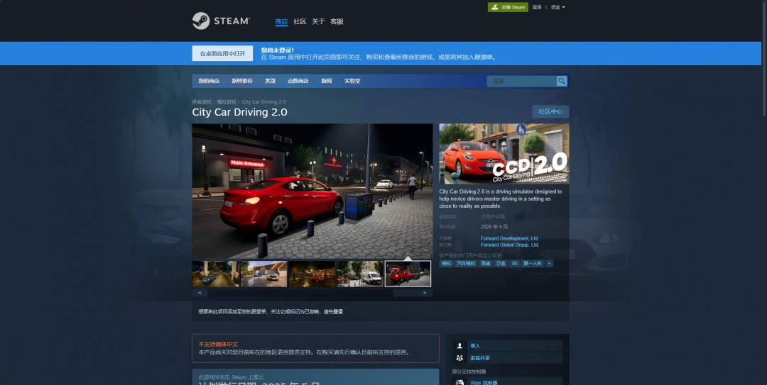 《城市汽车驾驶2.0》是一款由Forward Development, Ltd.制作发行的驾驶模拟游戏,而这款游戏的下载网址就是购买平台的购买页面,比如Steam版就是在购买页面购买之后,点击页面中的马上开玩就可以开始下载了。