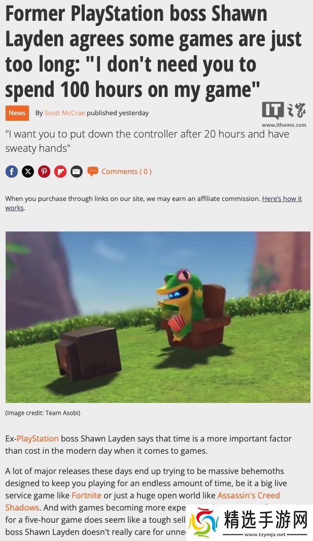 随后他将视角代入玩家,称“我不想让玩家花 100 小时在我的游戏上,20 小时手心冒汗的游戏体验足矣。”他还称《宇宙机器人》“把每个关卡都做得很好,很紧凑。”