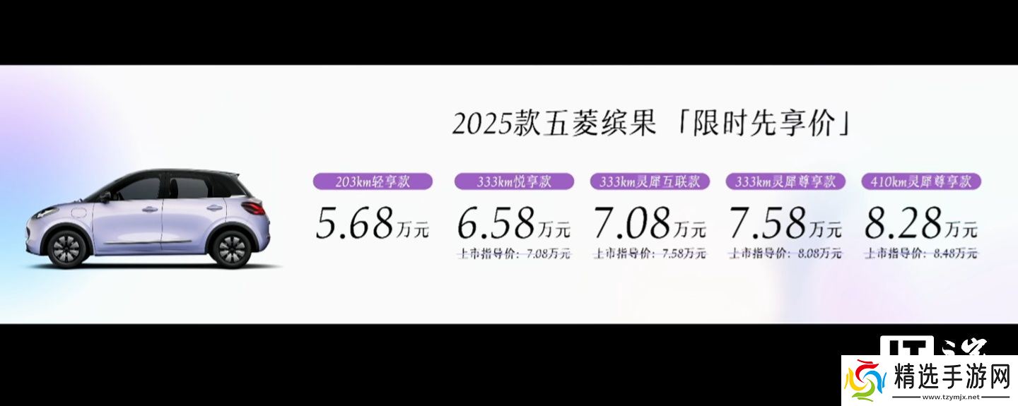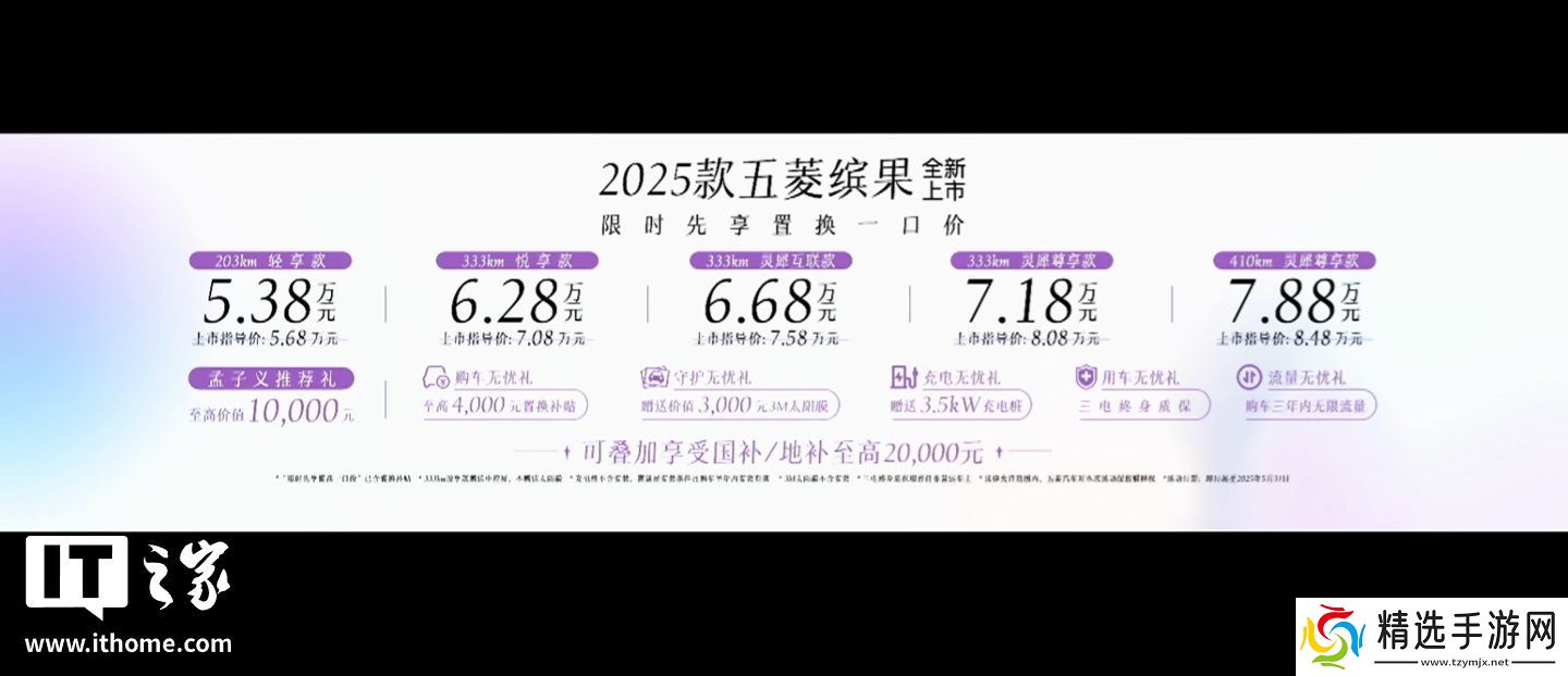 本站 4 月 19 日消息,2025 款五菱缤果纯电小车今日上市,新增芋泥紫等配色,全新升级浮岛式双层中央扶手,官方指导价 5.68 万元起,限时先享置换一口价 5.38 万元起,还可叠加国补 / 地补。