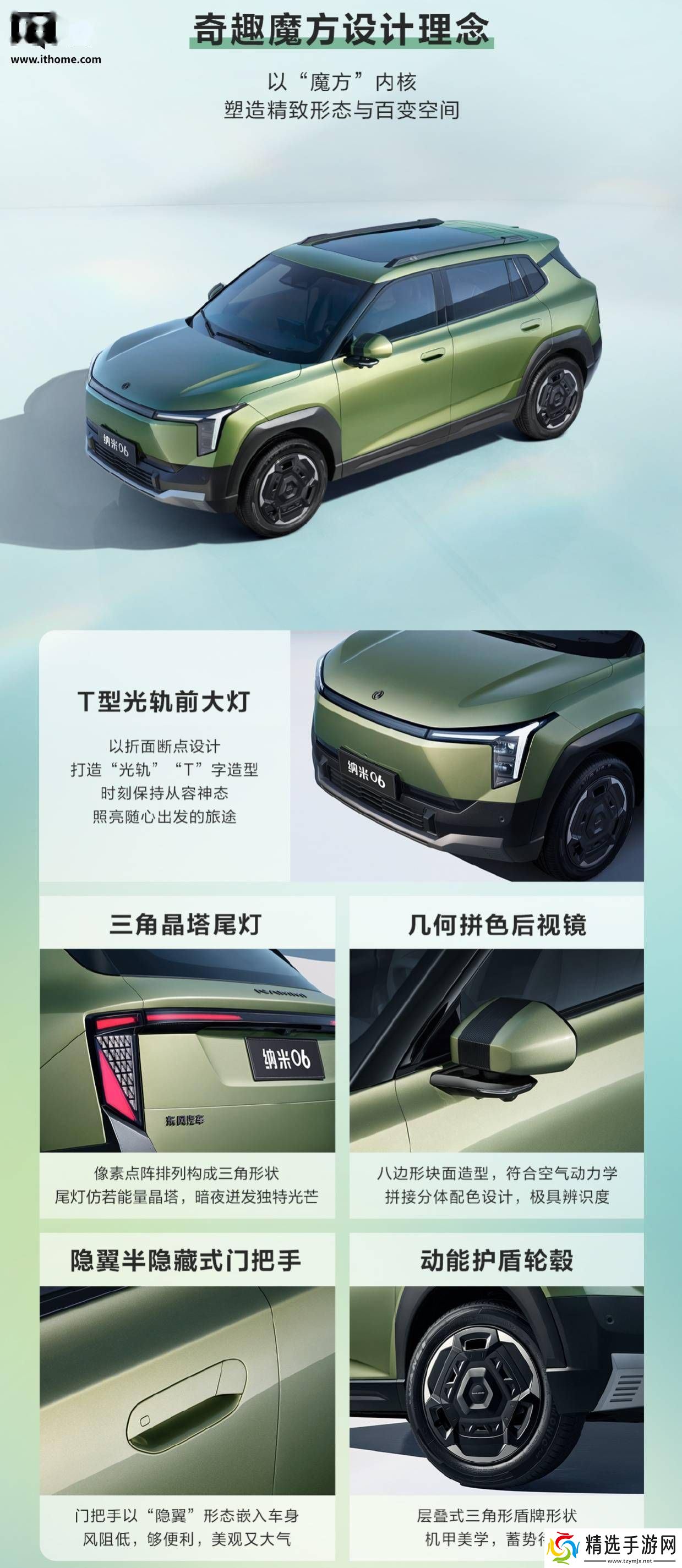纳米06采用了名为“奇趣魔方”的设计理念,外观方面,它配备了T型光轨前大灯、三角晶塔尾灯、几何拼色后视镜以及隐翼半隐藏式门把手等特色元素,动能护盾轮毂更是为其增添了几分动感。东风汽车此次还与中国国家地理携手,为纳米06推出了五款个性化车色,包括漫野绿、踏浪白、星砂银、扶光橙和油彩黄,为消费者提供了多样化的选择。