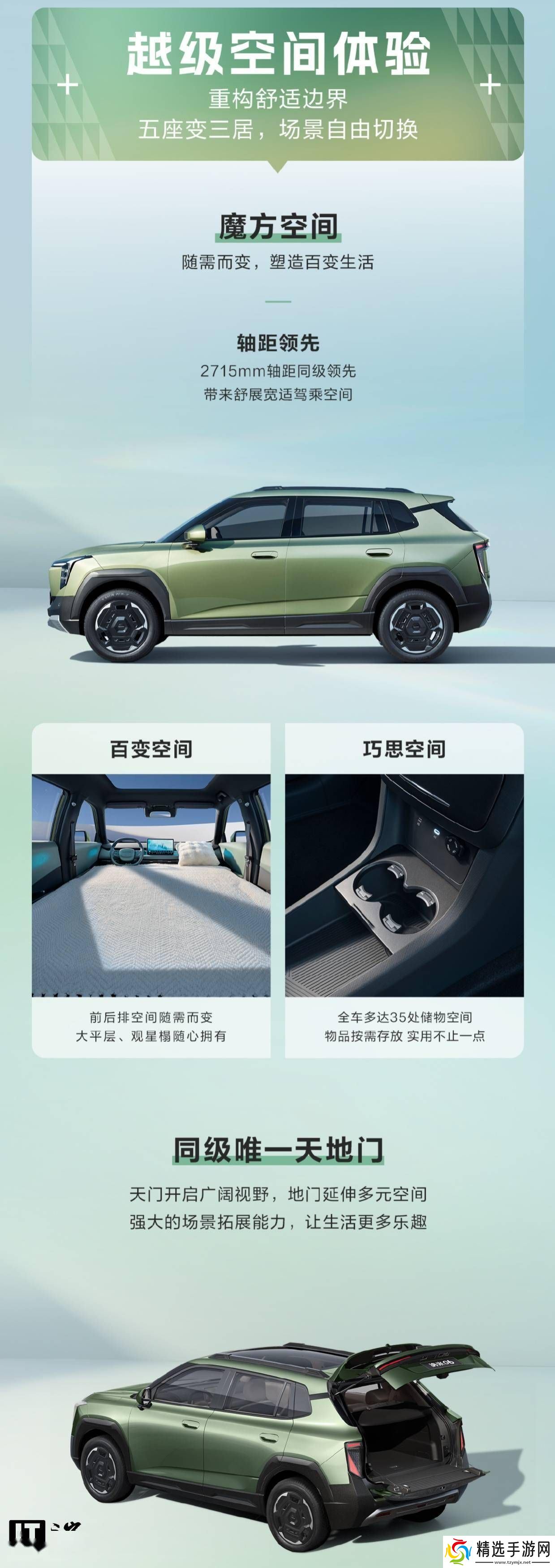 在空间设计上,纳米06主打“越级空间体验”。其轴距达到了2715mm,前后排空间可根据乘客需求进行灵活调整,如大平层和观星榻等模式。全车还设计了多达35处储物空间,极大提升了实用性。纳米06还配备了同级车型中唯一的天地门设计,地门承载能力达到150公斤,后备箱支持两层开合,容积高达500升。