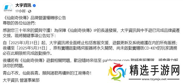 近日,大宇资讯正式对外宣布,其经典游戏品牌《仙剑奇侠传》的运营权即将发生变动。这一消息引起了广大玩家的关注和讨论。
