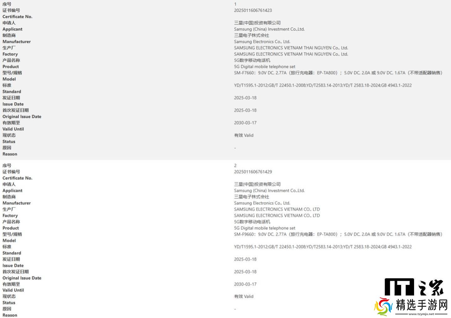 值得注意的是,早在今年3月,三星两款新机——型号分别为SM-F7660和SM-F9660的Galaxy Z Flip 7与Galaxy Z Fold 7,就已通过国家3C质量认证。这两款新机均支持25W快充,并且在销售时将不附带充电器。