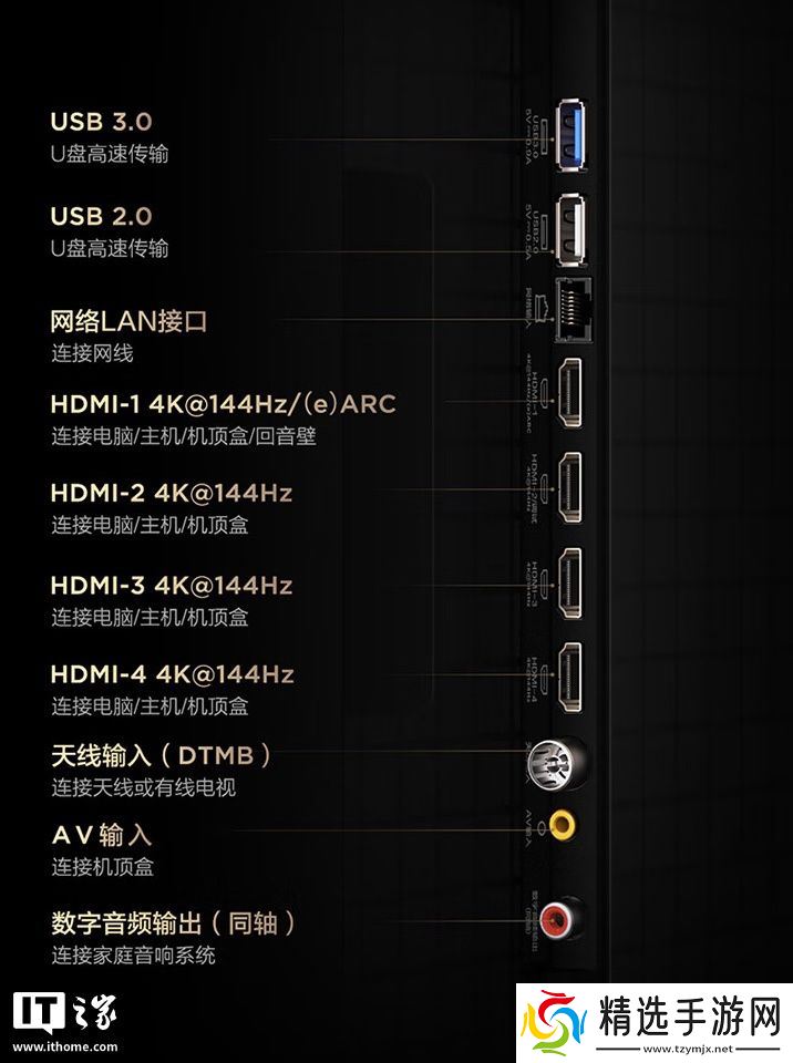接口方面,系列电视提供4个 HDMI 2.1接口、1个 USB-A 3.0接口、1个 USB-A 2.0接口、天线输入接口、AV输入接口、数字音频输出接口。
