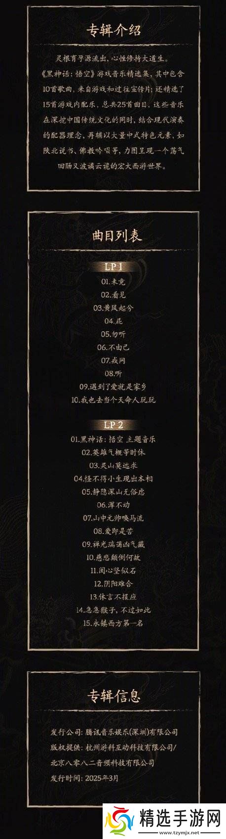 此次精选集涵盖了《黑神话:悟空》宣传片中的音乐以及游戏内的配乐,总计收录了25首精彩曲目。这些音乐不仅在游戏内深受玩家喜爱,更在宣传阶段就以其独特的风格和深情的旋律吸引了大量关注。