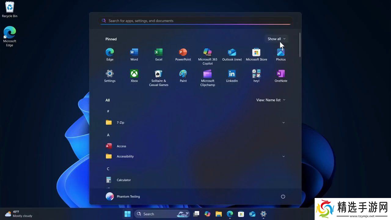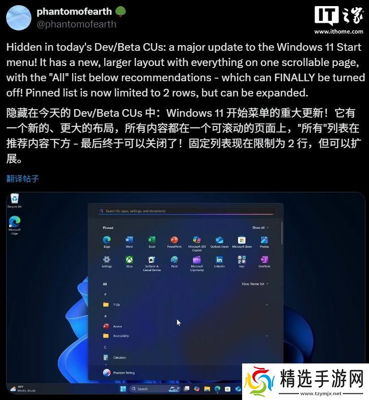 根据爆料人 phantomofearth 今日晒出的视频,Windows 11 终于放弃了双栏开始菜单设计,改为单栏可滚动视图。用户固定的图标会位于开始菜单顶部,而所有应用列表位于其下方 —— 只需开始滚动,即可浏览所有已安装的应用,无需再点击“全部”按钮。