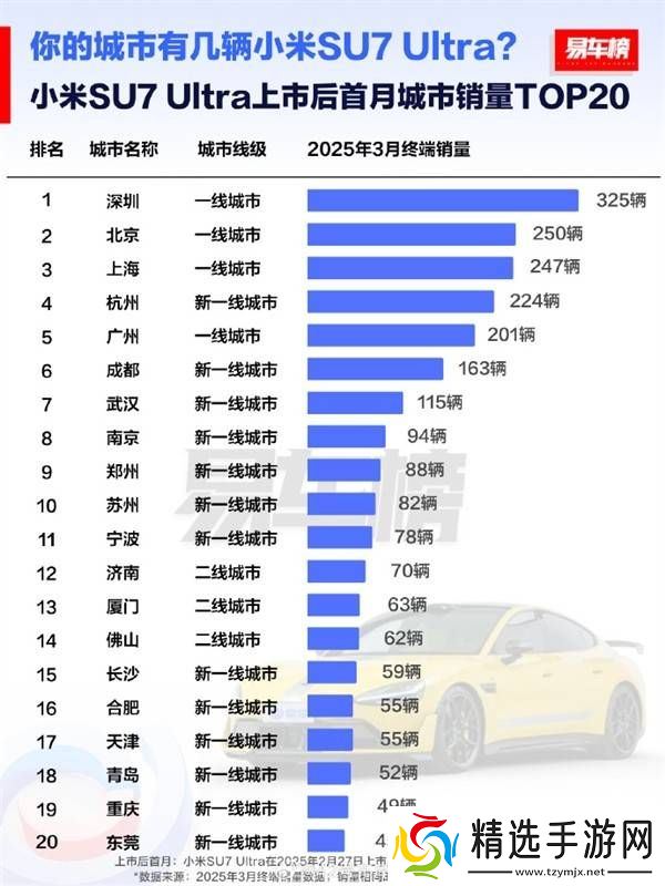 近日,小米SU7 Ultra上市首月的销售数据由易车平台正式揭晓,揭示了这款科技新品在中国各大城市的受欢迎程度。数据显示,销量排行榜前20名中,高达17个城市属于一线城市或新一线城市范畴,凸显了这些地区对高端科技产品的强烈需求。