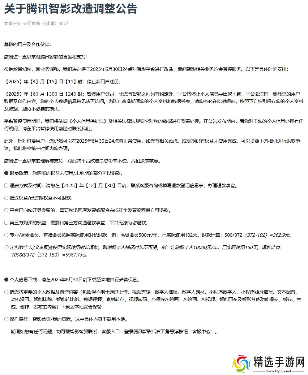 2025 年 6 月 30 日 24 时:暂停用户登录,除用户与智影之间另有约定外,平台将停止个人信息导出或下载,平台会注销、删除用户数据及创作内容,个人数据信息将无法再访问。为防止改造期间用户个人资料和数据丢失,请务必在此时间前,按照下方指引保存个人资料及数据,避免不必要的损失。