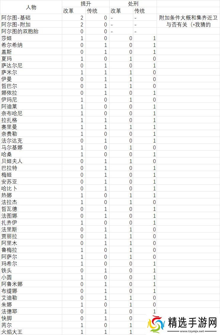 《苏丹的游戏》中各个人物在**成功后的“阶梯”仪式中接受提升和处刑后,会对后面的“果实”仪式中改革和传统数值产生的影响,然而很多玩家不清楚具体的数据,首先,所有受到提升和处刑的人物数值将单纯累计到仪式中“大权在握”的阿尔图身上。