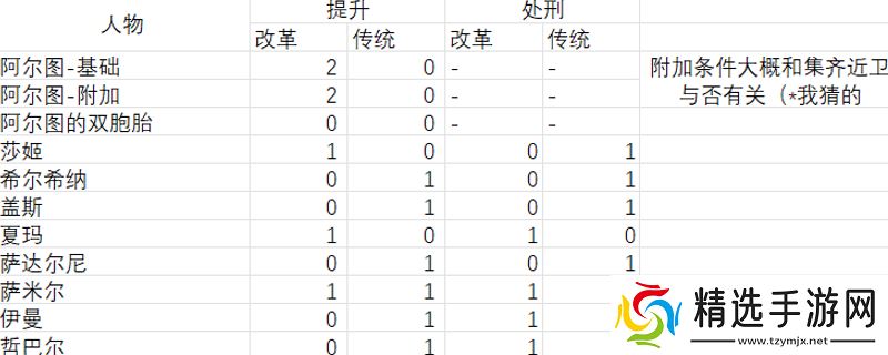 阿尔图在“果实”中的数值就将是自己的改革+提升盖斯的改革+处刑奈布哈尼的改革=2+0+0=2改革,和自己的传统+提升盖斯的传统+处刑奈布哈尼的传统=0+1+1=2传统。