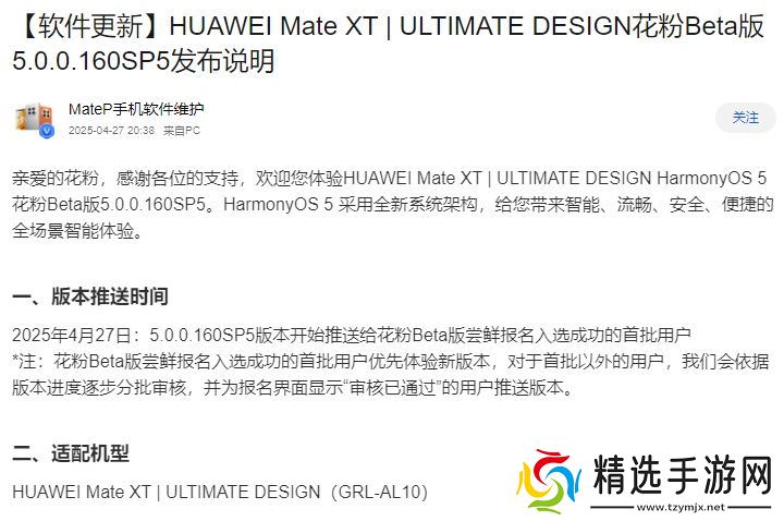 本站 4 月 27 日消息,华为 Mate XT | ULTIMATE DESIGN 今日开启推送 5.0.0.160SP5 花粉 Beta 版,尝鲜报名入选成功的首批用户优先体验新版本。对于首批以外的用户,华为会依据版本进度逐步分批审核,并为报名界面显示“审核已通过”的用户推送版本。