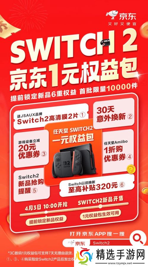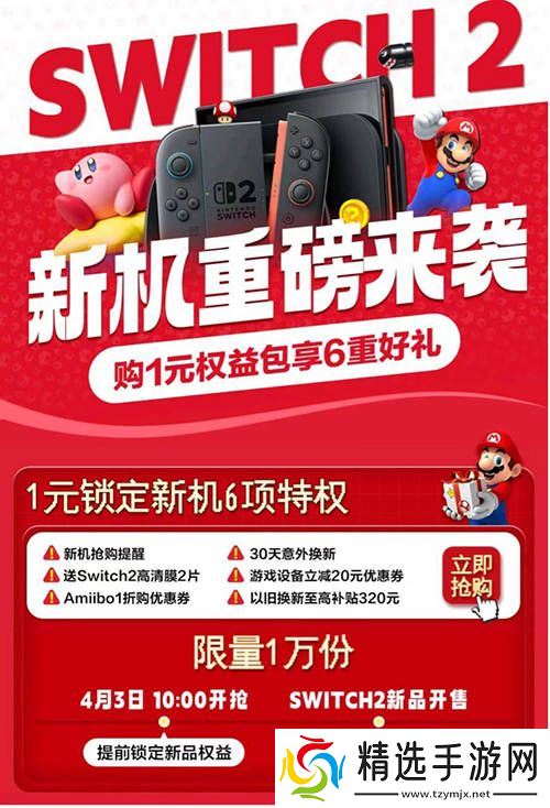 京东为了提升消费者的购买体验,特别推出了诚意满满的1元权益包。购买Switch 2的消费者将获赠JSAUX品牌的高清膜两片,确保新机的屏幕得到妥善保护。京东还提供Switch 2新品抢购提醒服务,让消费者不错过任何购买机会。更令人惊喜的是,京东还推出了30天意外换新服务,为消费者提供了额外的保障。在补贴方面,京东准备了游戏设备立减20元优惠券、任天堂Amiibo 1折购优惠券,以及Switch以旧换新至高补贴320元的福利,让消费者能够以更实惠的价格入手心仪的游戏机。