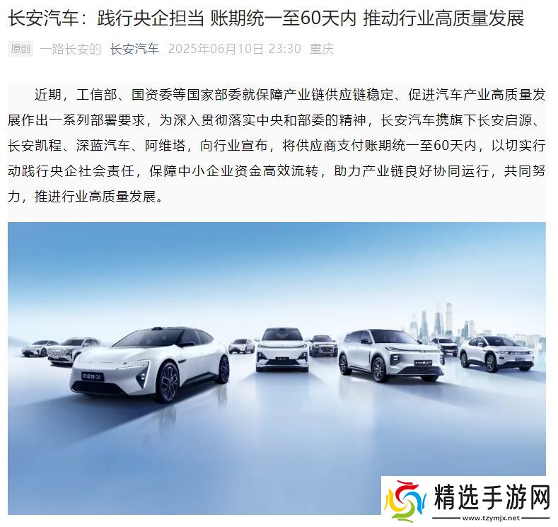 本站 6 月 10 日消息,长安汽车今日晚间发文,携旗下长安启源、长安凯程、深蓝汽车、阿维塔,向行业宣布,将供应商支付账期统一至 60 天内,以切实行动践行央企社会责任,保障中小企业资金高效流转,助力产业链良好协同运行,共同努力,推进行业高质量发展。