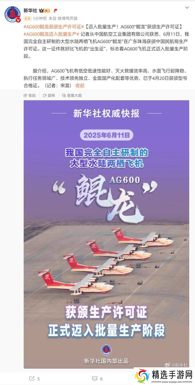 回顾5月18日,AG600“鲲龙”批生产首架机在广东珠海成功完成了生产试飞。这次试飞验证了该架机的生产完全符合设计要求,已达到安全可用的状态,并且具备了出厂的条件。这一重要进展标志着AG600飞机成功通过了取得生产许可证的关键环节,其实物状态也满足了生产许可证的构型要求。