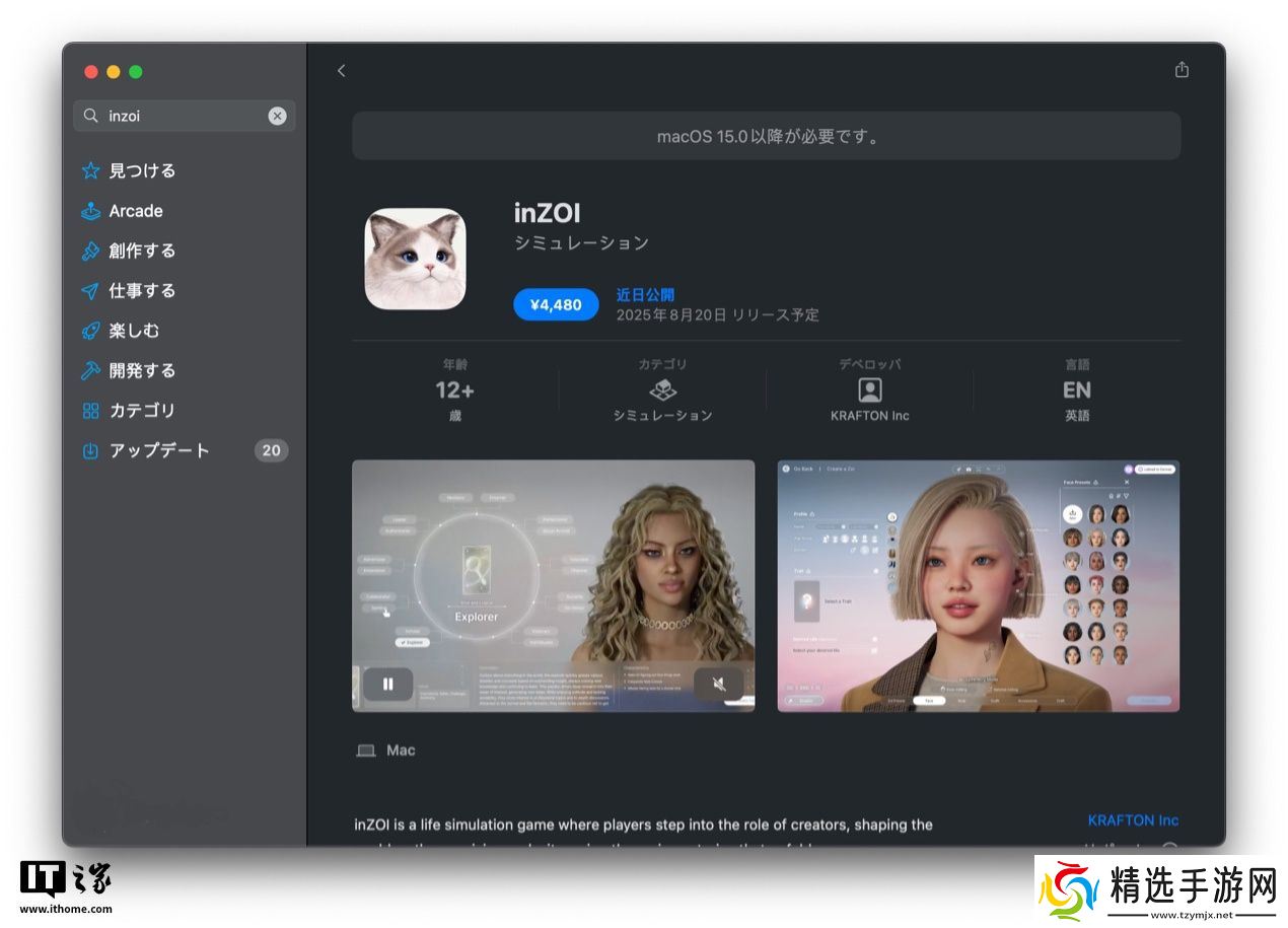 同时,根据本站此前报道,《inZOI 云族裔》也将登陆 macOS 平台,该游戏将于 8 月正式上线 Mac App Store,目前已开放预购,预购价格 4480 日元(本站注:现汇率约合 222 元人民币)。