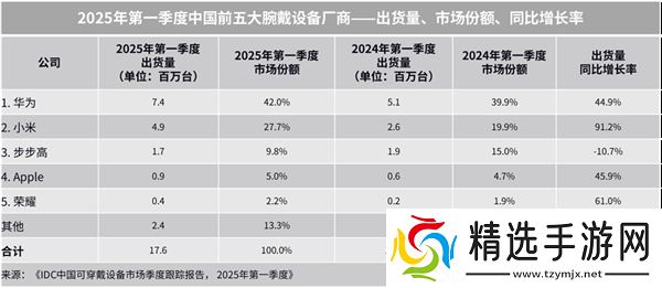 根据IDC最新统计数据,华为在2025年第一季度全球腕戴设备市场中,实现了出货量的显著飞跃,同比增长高达42.4%,一举夺得市场冠军。这一成就标志着华为在智能穿戴领域的持续创新与努力得到了全球消费者的广泛认可。