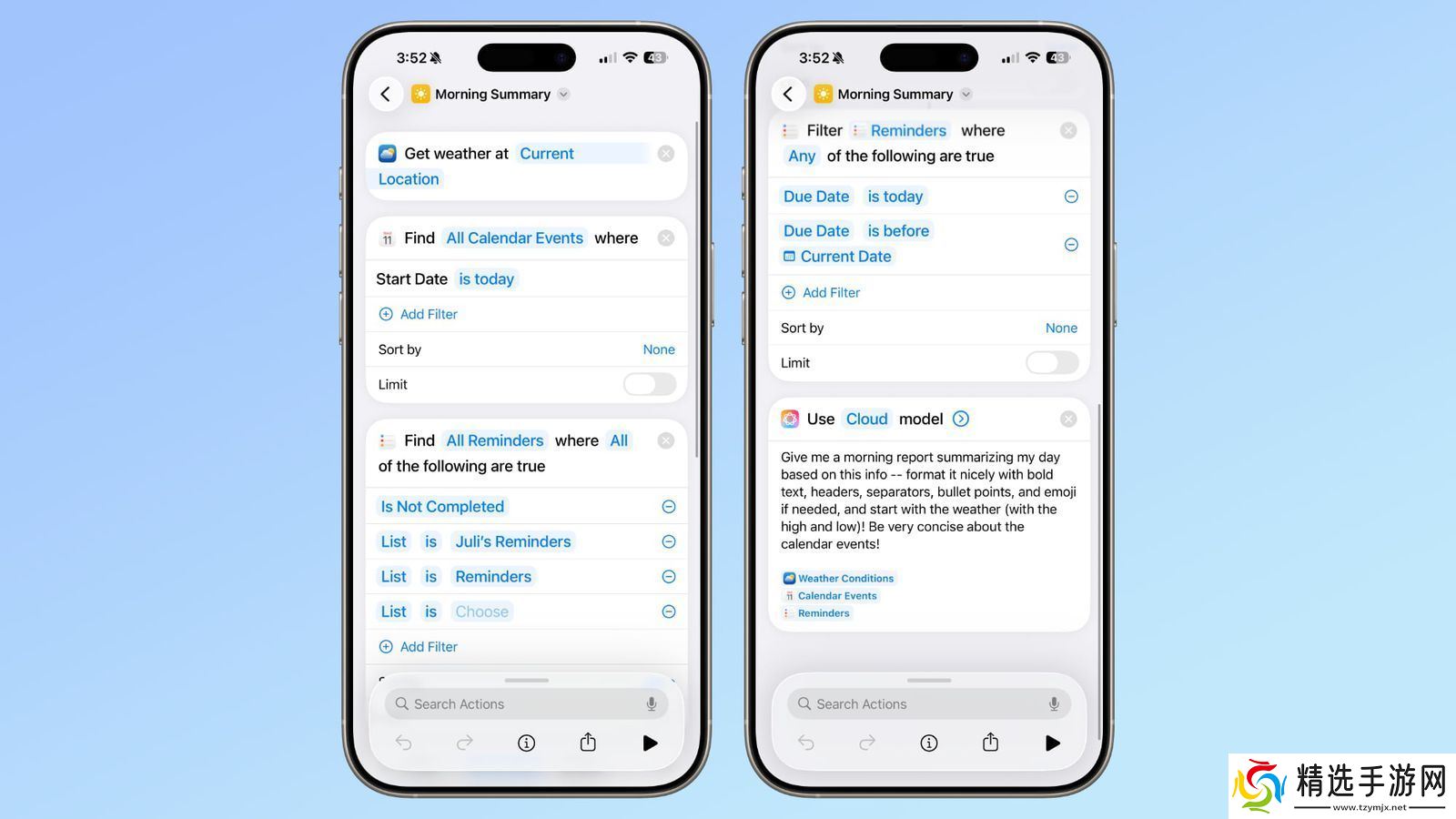 此外,用户还能创建自定义快捷方式,结合 Apple Intelligence 模型,灵活整合天气、日历和提醒事项等应用数据,生成个性化总结或执行复杂任务。
