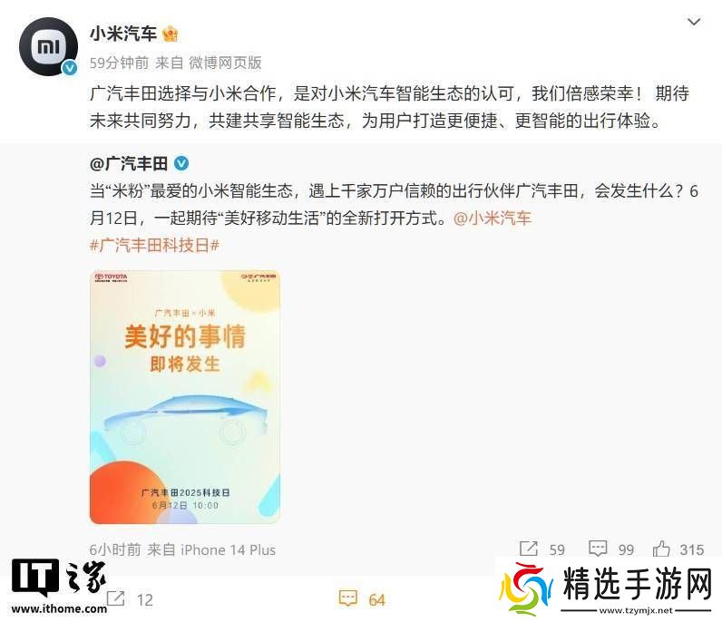 小米汽车与广汽丰田携手共创智能出行新时代。近日,小米汽车官方通过社交媒体平台,对与广汽丰田即将展开的合作表达了高度期待与荣幸之情。小米汽车方面表示,广汽丰田选择与其合作,无疑是对小米汽车智能生态的极大认可。