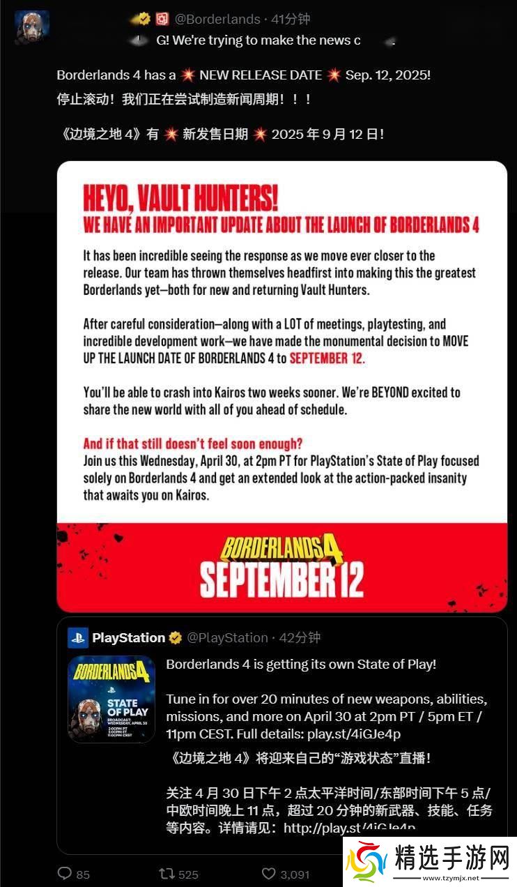 这款备受瞩目的游戏将登陆PS5、Xbox Series、PC以及Switch 2等多个平台,为玩家带来全新的游戏体验。PlayStation还将在北京时间5月1日早上5点推出专门针对《无主之地 4》的“State of Play”节目,这无疑为粉丝们增添了更多期待。
