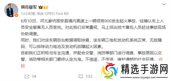 领克汽车销售有限公司迅速对此事作出回应,公司副总经理穆军公开发声。他确认,6月10日,一辆领克900在河北廊坊固安县的高速公路上确实发生了起火事故,但幸运的是,车内人员已安全撤离,未造成任何人员伤亡。
