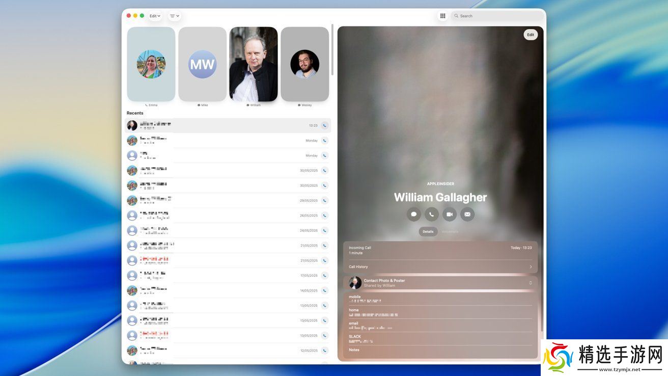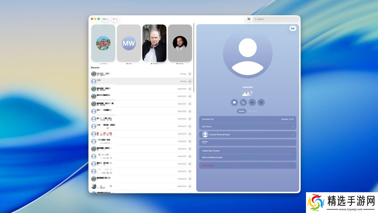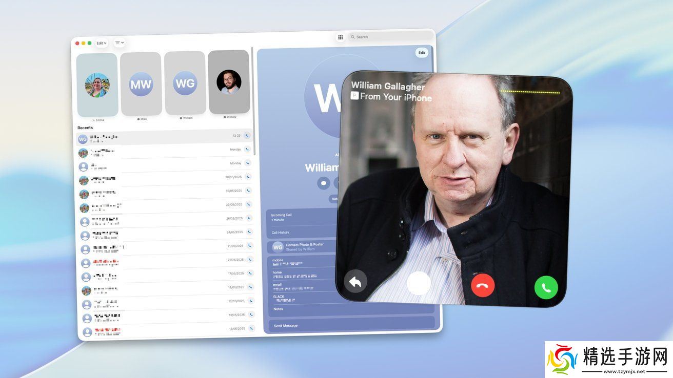 电话应用的界面设计借鉴了 iOS 的最新版本,在 Mac 大屏幕上重现了“统一视图”(Unified View),默认界面显示最近通话记录和常用联系人列表,并支持联系人照片和海报展示。