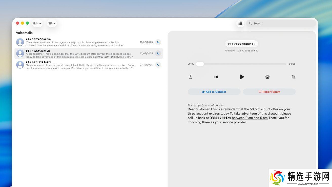 点击最近通话记录,可查看联系人详情,包括通话历史、沟通方式及语音留言。此外,应用还提供多种列表选项,如未接来电(Calls Missed)、语音留言(Voicemail)和*来电(Spam),方便用户管理通话记录。语音留言功能也同步到 Mac,用户可直接播放录音或阅读转录文本。