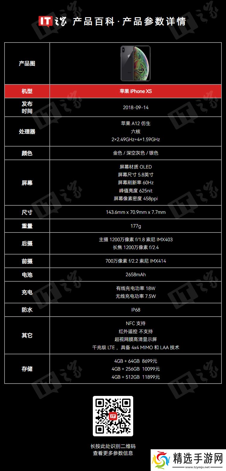 苹果 iPhone XS 手机发布于 2018 年 9 月 12 日,该机延续了 iPhone X 的“刘海”全面屏设计,搭载 5.8 英寸超视网膜显示屏,配有 A12 仿生芯片,相比上一代 A11 仿生芯片性能提升 15%,功耗更低;出厂搭载 iOS 12 系统,可选 64/256/512GB 容量,售价 8699 元起。
