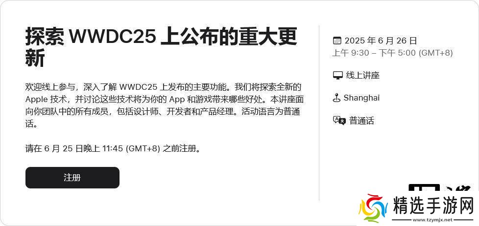 值得注意的是,苹果公司还特别为中国市场准备了一场线上讲座,定于6月26日上午9点30分举行。这场讲座将以普通话进行,内容聚焦于WWDC25上发布的主要功能及新技术。苹果诚邀设计师、开发者及产品经理等团队成员积极参与,共同探索这些新技术如何为App和游戏开发带来前所未有的机遇与优势。