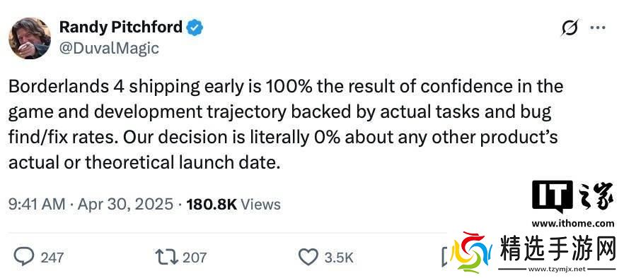 面对外界的种种猜测,Gearbox的创始人Randy Pitchford迅速在社交媒体上进行了回应。他坚决否认了《无主之地4》提前发售与《GTA 6》有任何关联,强调这一决定完全是基于游戏本身的品质和开发进度。Pitchford表示,团队对游戏的开发进展感到非常满意,特别是在任务完成度和Bug修复速度方面,这让他们有信心将发售日期提前。