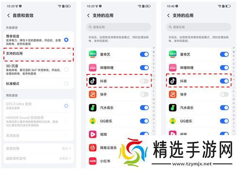 退出“支持的应用”界面,进行尊享低音、3D 沉浸、标准模式音效切换,使用抖音时将体验到环绕低音炮的效果