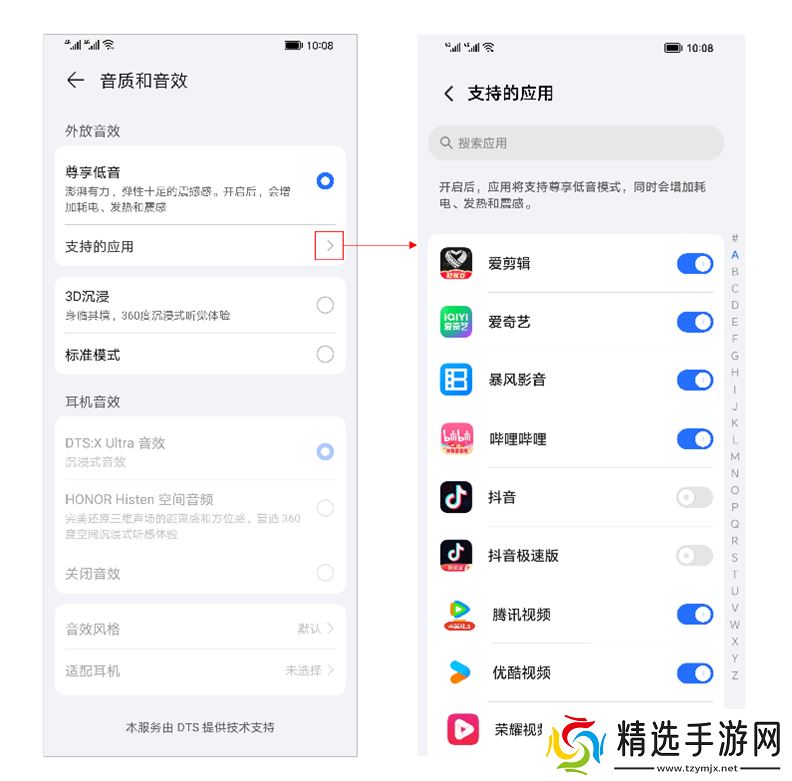 设置 > 声音和振动 > 音质和音效 > 尊享低音 > 支持的应用