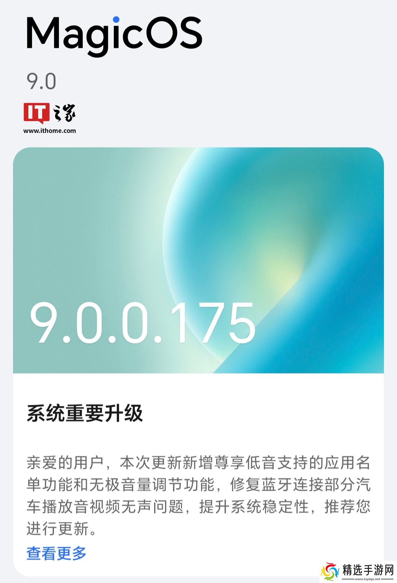 本站 6 月 14 日消息,荣耀 Magic7 系列手机现开启 MagicOS 9.0.0.175 新版本升级,系统包大小约 341MB,补齐了无极音量调节、尊享低音支持应用名单功能。