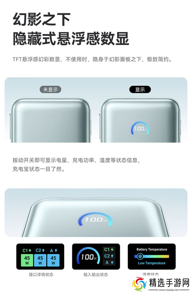 据介绍,这款移动电源正面提供隐藏式TFT显示屏,可以显示接口功率、温度状态等信息,提供70厘米USB-C线及 1 个额外的 USB-C接口,输出功率均为45W;而移动电源的USB-A接口输出功率为24W。