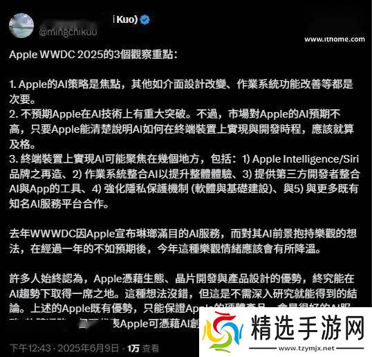 郭明錤展望苹果WWDC 2025:AI策略成焦点,技术突破或有限