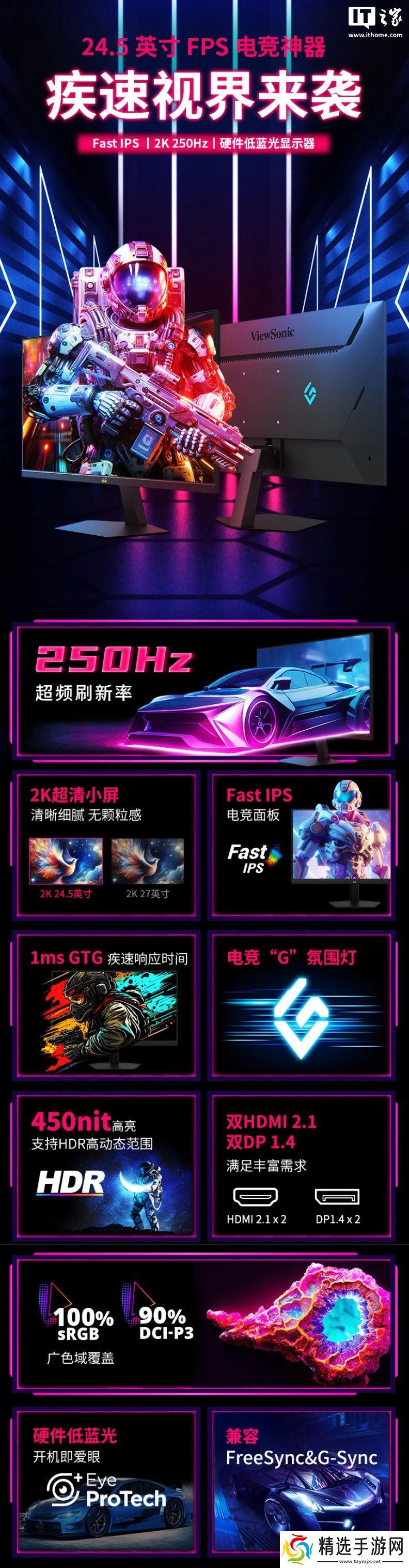 本站获悉,这款显示器搭载一块2560x1440分辨率250Hz超频Fast IPS 面板,显示器亮度450尼特,GtG响应速度1ms,覆盖 100% sRGB和90% DCI-P3色域。