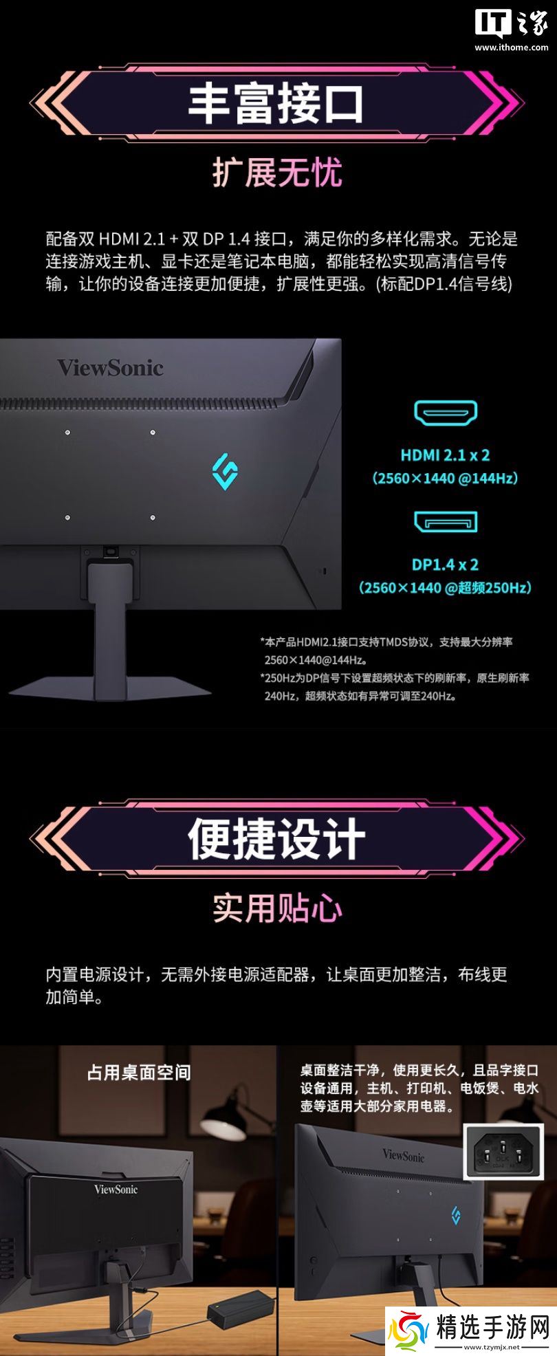 其他方面,该显示器内置电源,提供2 个 HDMI 2.1(144Hz)和2个 DP 1.4(250Hz)接口。