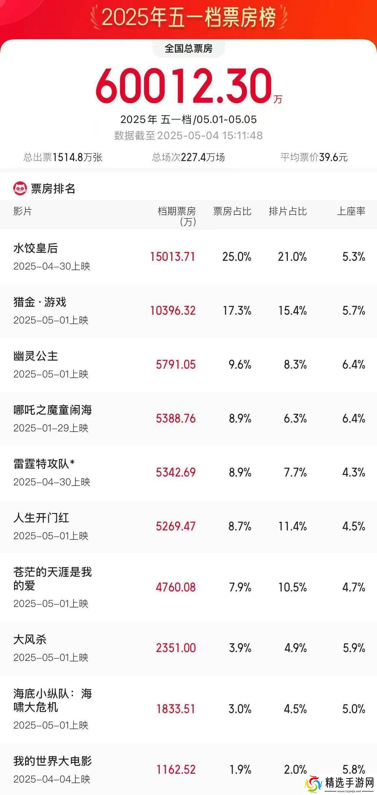 其他影片同样表现不俗。《哪吒之魔童闹海》以5388.76万元的票房排在第四位,而《雷霆特攻队 *》则以5342.69万元的票房紧随其后。喜剧片《人生开门红》和《苍茫的天涯是我的爱》分别以5269.47万元和4760.08万元的票房成绩跻身前六。动作片《大风杀》则以2351.00万元的票房位列第七。动画电影方面,《海底小纵队:海啸大危机》和《我的世界大电影》分别以1833.51万元和1162.52万元的票房收入,为档期贡献了一份力量。