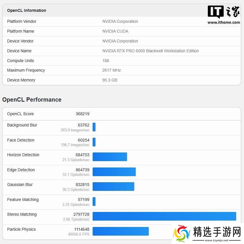 在Geekbench 6.4.0的测试中,RTX PRO 6000 Blackwell工作站版的OpenCL得分达到了368219分,虽然略低于RTX 5090的376,858分,但差距并不大,仅为2.3%。据外媒分析,这一差距可能是由于RTX PRO 6000 Blackwell工作站版目前尚未发布正式版驱动,且测试平台的显卡功耗可能受到限制。