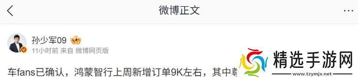 本站 6 月 16 日消息,博主@孙少军09 今日发文透露,鸿蒙智行上周新增订单 9K(此处预计指 9000)左右,其中尊界破 800。