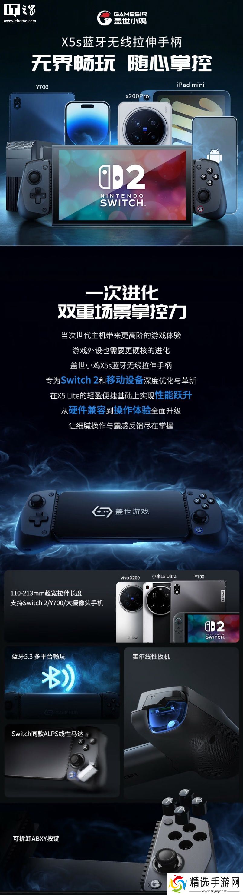 本站 6 月 16 日消息,盖世小鸡旗下 X5s无线拉伸手柄现已在京东上架并开启首销,这款手柄号称支持任天堂Switch 2游戏机,拥有 HD震动体感,定价为269元。