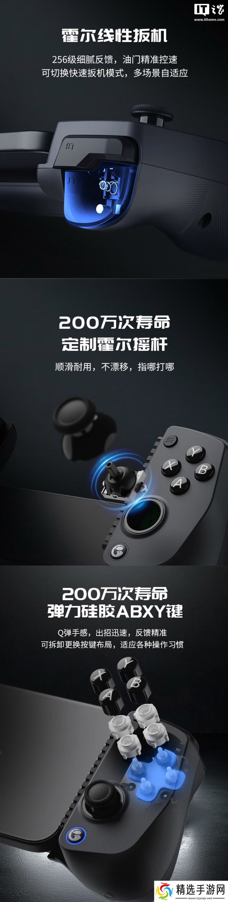 这款手柄支持蓝牙 / 2.4 双模,配备任天堂Switch同款 ALPS线性马达,支持HD震动,其 ABXY 键采用 200 万次寿命弹力硅胶材质,同时提供 200 万次寿命定制霍尔摇杆和256阶霍尔线性扳机,内置840毫安时电池。