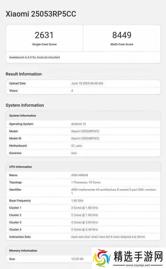 本站 6 月 18 日消息,小米平板 7S Pro(型号 25053RP5CC)今日现身 Geekbench 6 跑分库,其搭载的玄戒 O1 处理器单核分数为 2631,多核分数 8449。