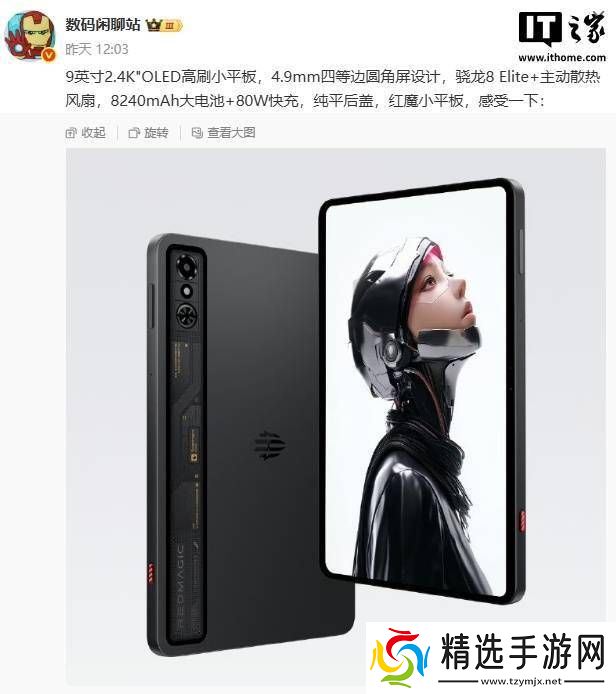 据透露,红魔电竞平板3 Pro将搭载一块9英寸的2.4K OLED显示屏,采用4.9mm的四等边圆角设计,视觉体验极为出色。核心硬件方面,该平板将配备骁龙8 Elite(又称骁龙8至尊版)处理器,并内置主动散热风扇,以确保高性能下的稳定运行。续航方面,8240mAh的大容量电池配合80W快充技术,将为用户提供持久的游戏和娱乐体验。