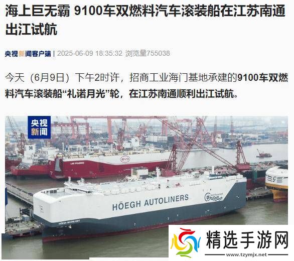近日,招商工业海门基地传来喜讯,其精心打造的9100车双燃料汽车滚装船“礼诺月光”轮,在江苏南通成功进行了出江试航。这一重要时刻发生在6月9日下午2时左右,央视新闻对此进行了详细报道。