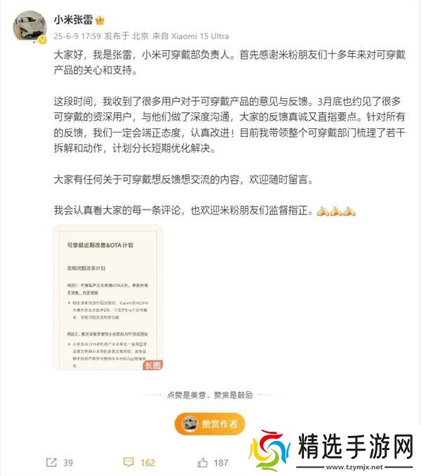近期,小米可穿戴部门负责人张雷公开分享了与用户深入交流的成果,强调团队对用户反馈的高度重视。