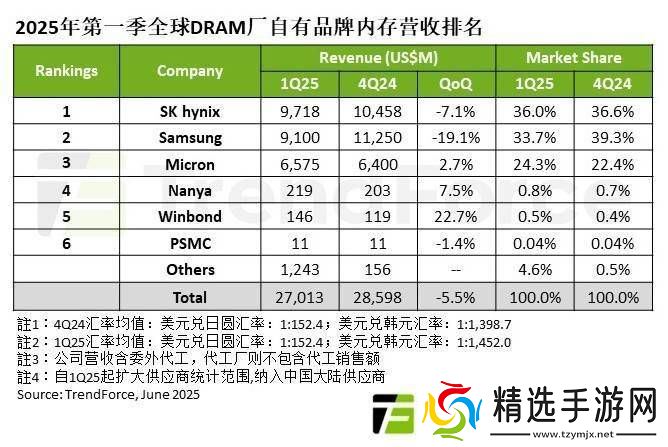 近日,全球DRAM市场动态再次引发关注。根据TrendForce集邦咨询最新发布的2025年第一季度全球DRAM厂商自有品牌内存营收排行榜,SK海力士成功登顶,这是该机构记录中的首次。这一趋势与Counterpoint先前的统计数据不谋而合,进一步确认了SK海力士在内存市场的强劲表现。