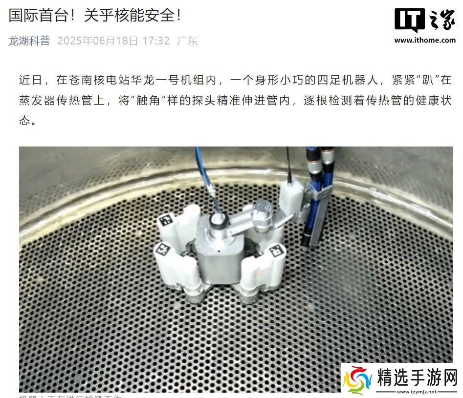 本站 6 月 20 日消息,综合科技日报、光明日报今日消息,全球首台四足传热管检测机器人在“华龙一号”机组成功通过工程应用测试。