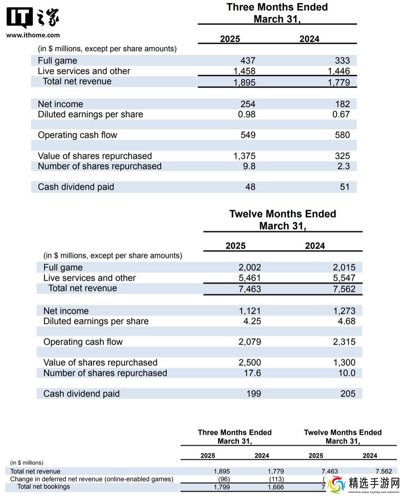 艺电公司近日揭晓了其2025财年的最终财务业绩,该财年截止至2025年3月31日。据报告,尽管面临行业内的诸多挑战,艺电全年净收入仍稳定在74.63亿美元,略低于上一财年的75.62亿美元。运营现金流下降至20.79亿美元,去年同期则为23.15亿美元。公司在全年内回购了价值25亿美元的股票。