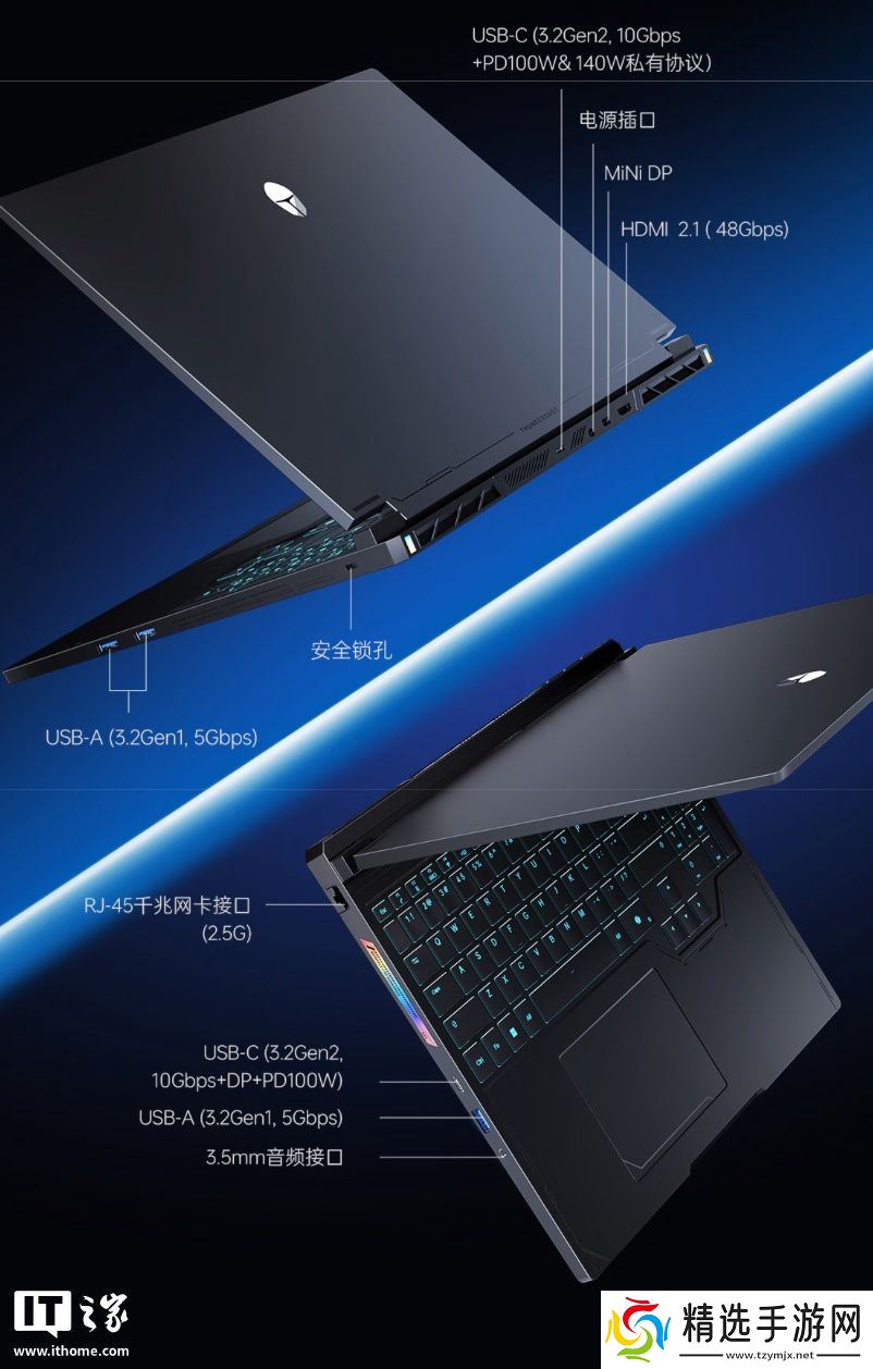 该机 A 面配备镜面雷神Logo,侧面带有雷神铭牌,支持180度开合,提供下沉式全尺寸RGB键盘,内置80Wh电池(本站注:支持140W快充),配备 250W 迷你 SiC 充电器。