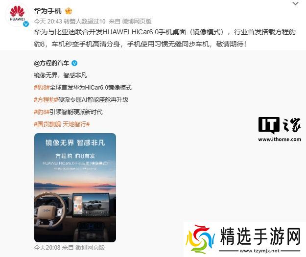 华为手机官方转发了相关消息,并称:“华为与比亚迪联合开发 HUAWEI HiCar 6.0 手机桌面(镜像模式),行业首发搭载方程豹豹 8,车机秒变手机高清分身,手机使用习惯无缝同步车机”。